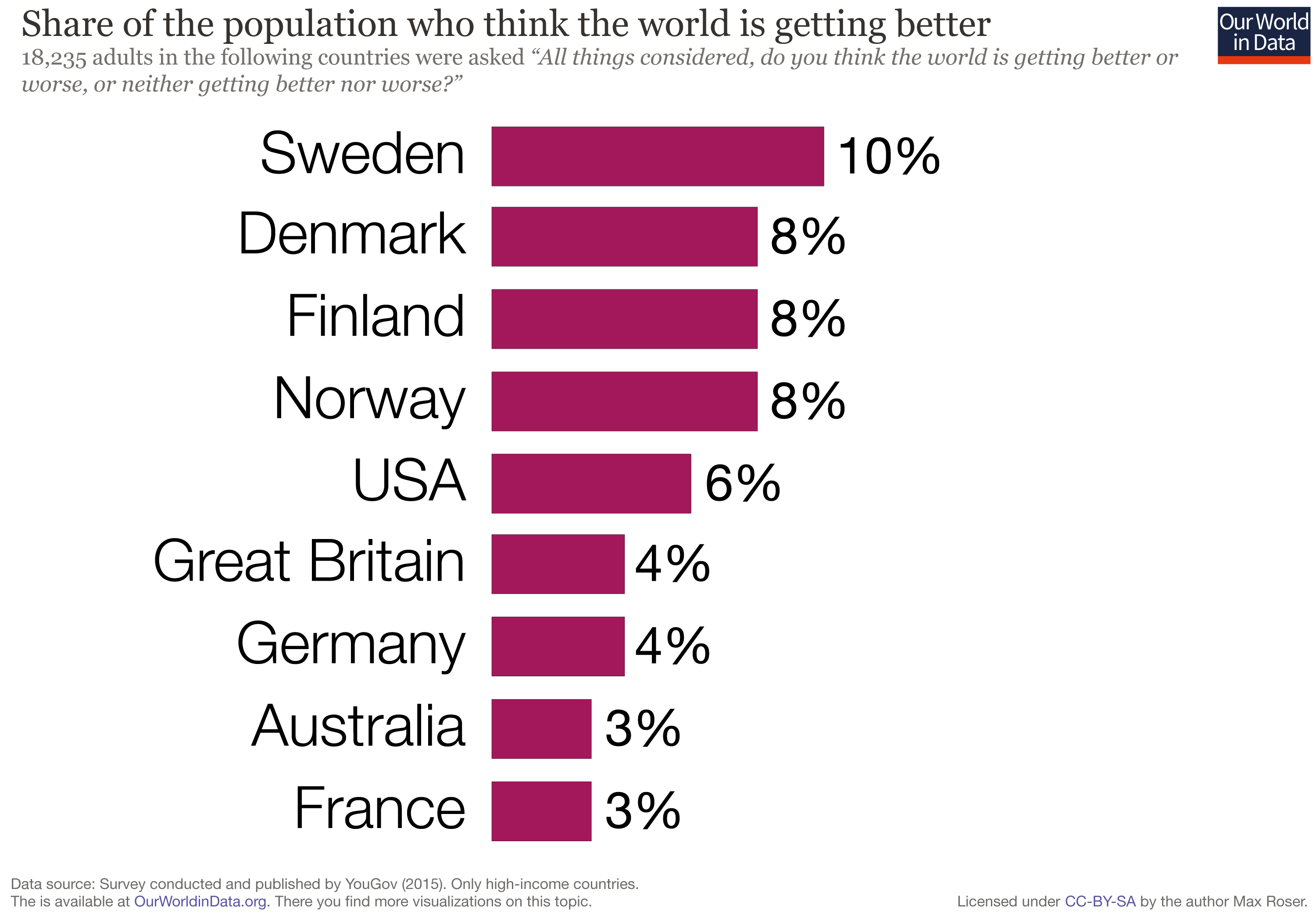 Our mission only makes sense if it is in fact possible to make progress against the large problems the world faces. Very few think the world is making progress. A recent survey asked “All things considered, do you think the world is getting better or worse, or neither getting better nor worse?”. In Sweden 10% thought things are getting better, in the US they were only 6%, and in Germany only 4%.