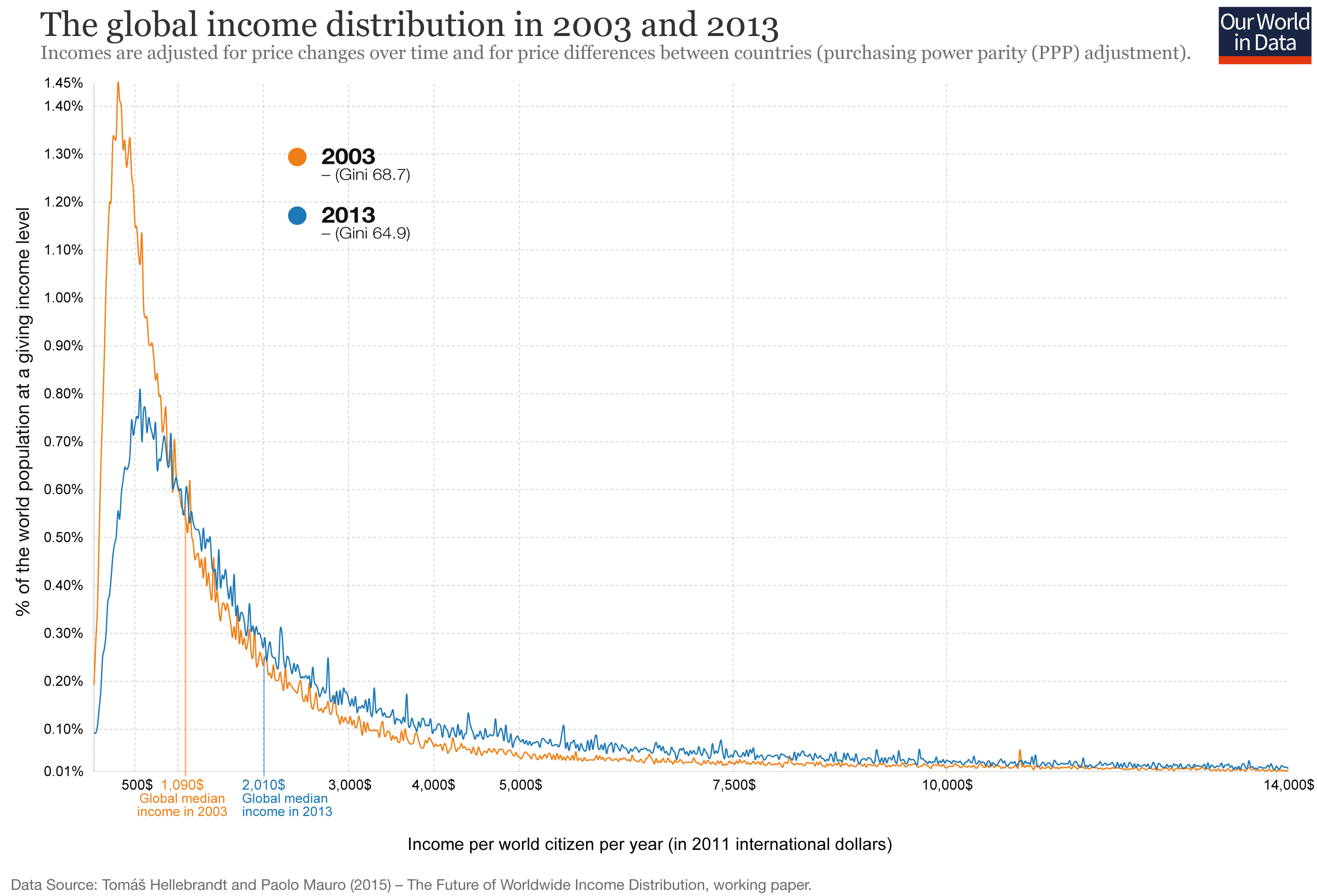 This visualization shows how the global income distribution has changed over the decade up to 2013. Tomáš Hellebrandt and Paolo Mauro, the authors of the paper8 from which this data is taken, confirm the finding that global inequality has declined: the Gini coefficient of global inequality has declined from 68.7 to 64.9.
