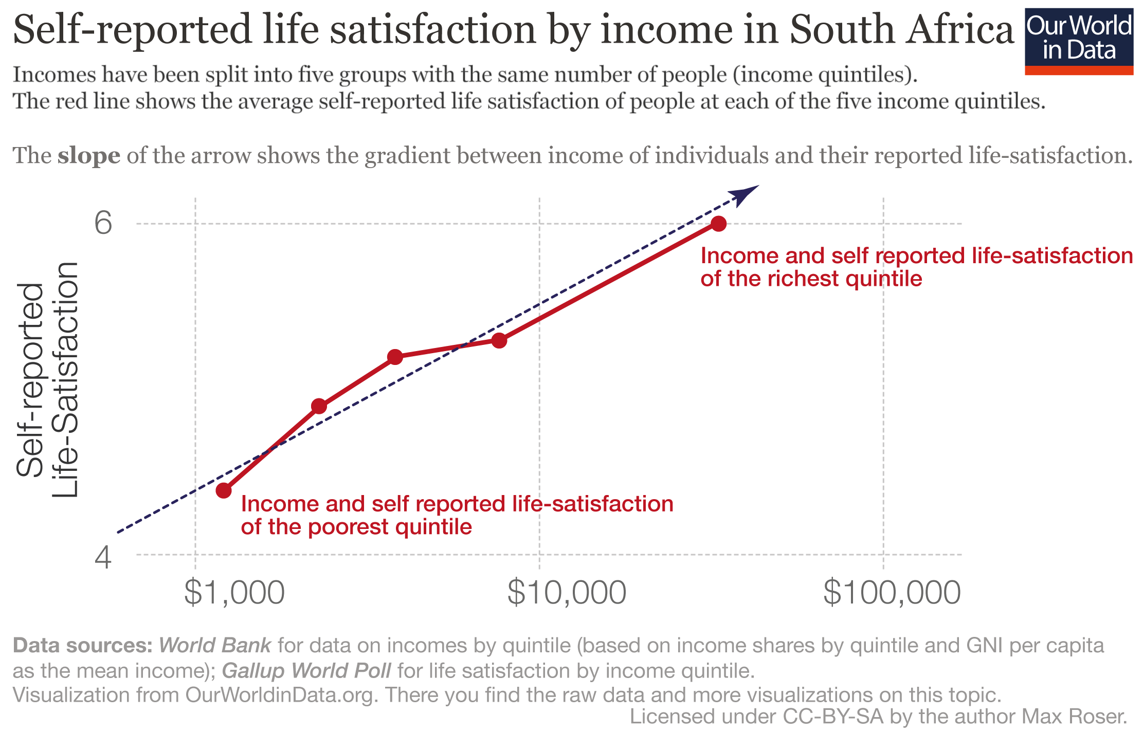 To show the income-happiness correlation within countries, each arrow has a slope corresponding to the correlation between household incomes and self-reported life satisfaction within that country. In other words: the slope of the arrow shows how strong the relationship between income and life satisfaction is within that country. (This chart gives you a visual example of how the arrows were constructed for each country). 9