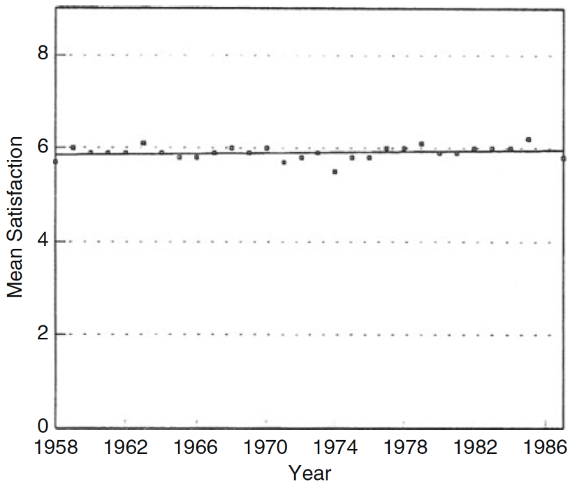 Let us begin with the case of Japan. There, the earliest available data on self-reported life satisfaction came from the so-called ‘Life in Nation surveys’, which date back to 1958. At first glance, this source suggests that mean life satisfaction remained flat over a period of spectacular economic growth (see for example this chart from Easterlin and Angelescu 2011).12 Digging a bit deeper, however, we find that things are more complex.