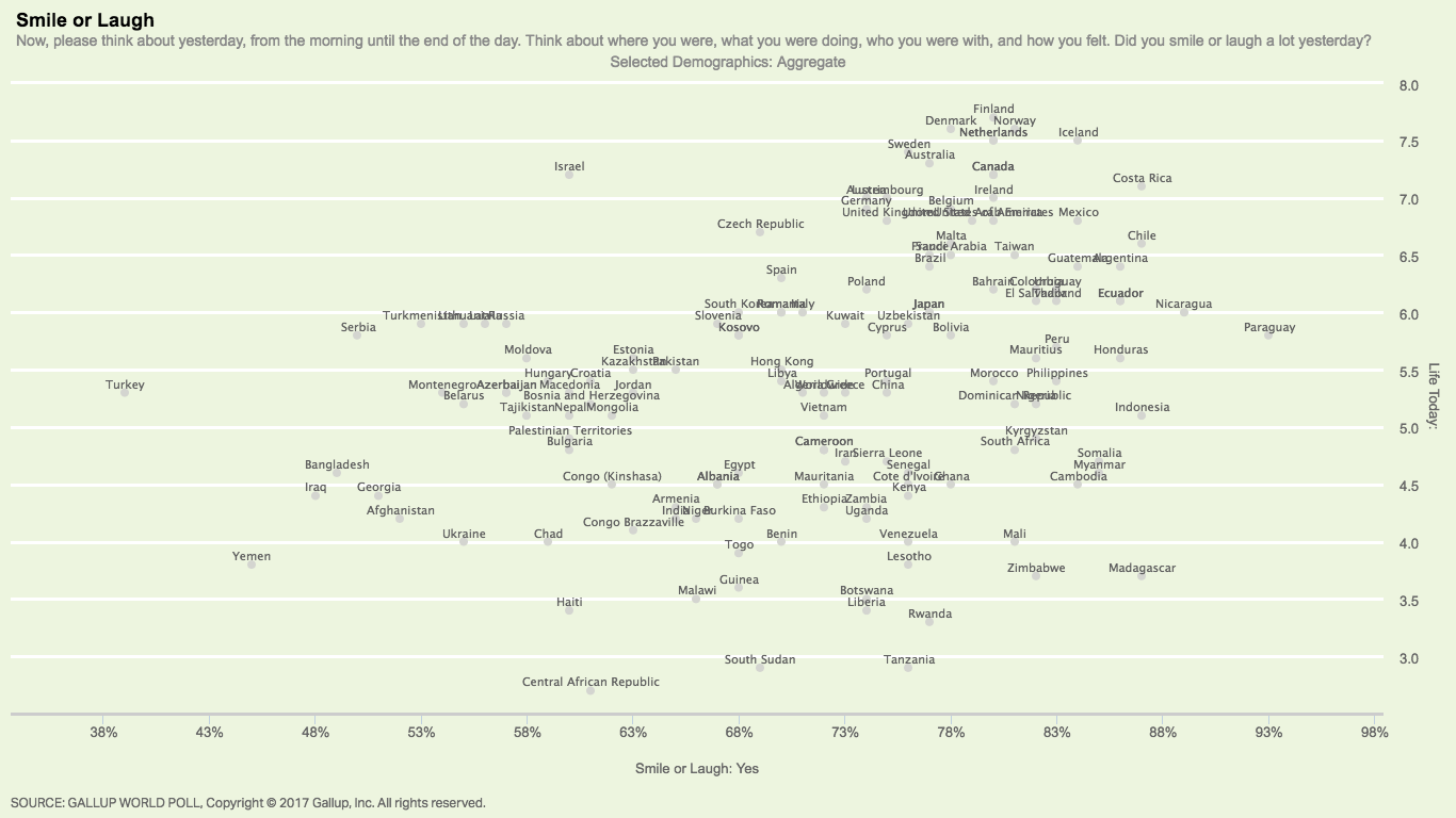 Self-reports about happiness and life satisfaction are known to correlate with things that people typically associate with contentment, such as cheerfulness and smiling. (In this scatter plot you can see that countries where people have higher self-reported life satisfaction are also countries where people tend to smile more).