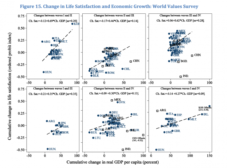 As we can see, countries that experience economic growth also tend to experience happiness growth across waves in the World Value Survey. And this is a correlation that holds after controlling for other factors that also change over time (in this chart from Stevenson and Wolfers (2008) you can see how changes in GDP per capita compare to changes in life satisfaction after accounting for changes in demographic composition and other variables).