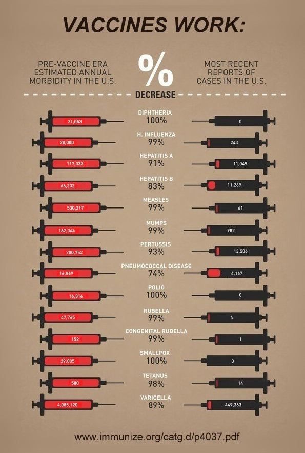 Data comparing the prevalence of diseases before and after the introduction of different vaccinations in the US can be found in Roush and Murphy (2007)14. Here we provide a table summarizing their findings. As it can be seen, in most cases the reduction of cases has been close to 100%.