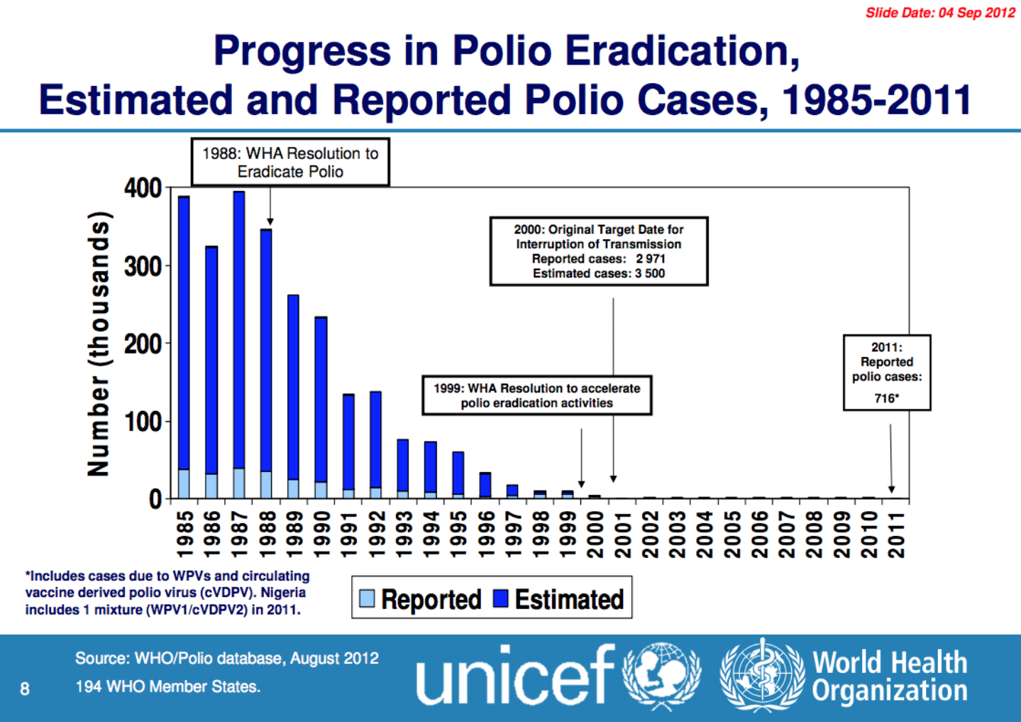 The World Health Organization relies on a similar methodology when estimating the total number of cases. This visualization by the WHO compares the number of reported cases with the number of estimated cases and arrives at very similar estimates to ours with the estimated global number of paralytic polio cases being above 400,000 in the 1980s.